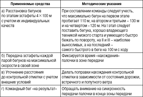 Известно, что в 30-метровой зоне разбега и передачи эстафеты ни один бегун не может развить своей максимальной скорости. Она достигается на более дальних отметках – 40–50 и даже 60–70 м. К тому же скорость бегуна, передающего эстафету, к концу дистанции заметно снижается. И это соотношение скоростей должно быть в первую очередь учтено при подборе пары спортсменов на смежных этапах. Кроме того, с учетом зон разбега (10 м) и передачи (20 м) спортсмены максимально пробегают на первом этапе 110, на втором и третьем – 130, на четвертом – 120 м. Поэтому при расстановке участников эстафетной команды по этапам необходимо учитывать их индивидуальные особенности (время двигательной реакции, способность к максимальному ускорению, уровень максимальной скорости, специальной выносливости, умение бежать по повороту и т. д.).