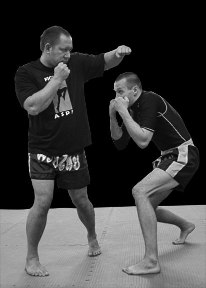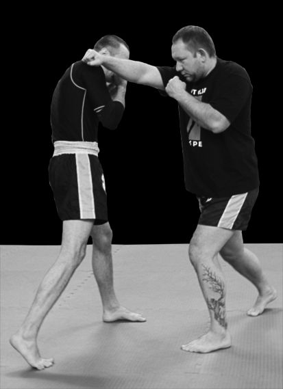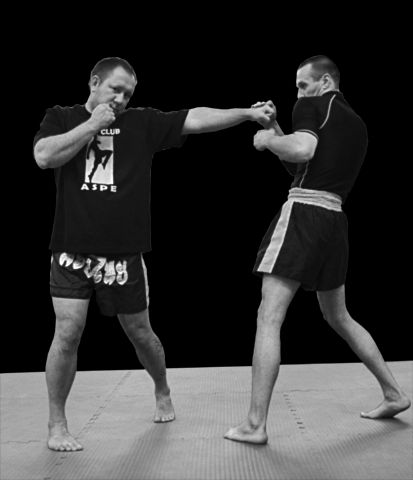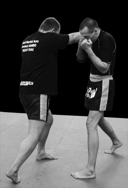 Рассмотрим на примере блока от прямого удара в лицо методику освоения защитной техники. Отработка блока начинается с отражения ударов, выполняемых партнером медленно поочередно левой и правой руками. Противник медленно ладонью бьет вас в лоб, а вы пытаетесь не дать ему возможности коснуться вашего лба. Чтобы свести на нет возможность травматизма, бить следует ладошкой в лоб, стараясь легко его коснуться. Постепенно по мере освоения уклона партнер повышает скорость ударов и начинает делать разные паузы между ударами, то выжидая, то нанося несколько ударов подряд. Затем он начинает бить не поочередно левой и правой руками, а произвольно наносить любое количество ударов то правой, то левой рукой, с любой скоростью и с любыми паузами между ударами. Таким же образом ставятся все блоки, подставки и уклоны. После полного освоения всех защитных действий против ударов руками необходимо объединить их в одну стройную систему. Противник надевает перчатки и начинает мягко, в спокойном темпе, атаковать любыми одиночными ударами рук и локтей. Ваша задача: используя весь свой арсенал защитных действий, не дать себя ударить. Постепенно, по мере роста вашего мастерства в защите, вашему партнеру необходимо будет увеличивать скорость нанесения ударов, начинать работать сериями и бить более жестко. Необходимо прорабатывать отдельно защиту на дальней, средней и ближней дистанциях, отрабатывать защиту одними блоками или одними уклонами и передвижениями, прорабатывать ситуации, когда вас загнали в угол, или, наоборот, двигаться по ограниченной площадке так, чтобы не дать противнику достать вас ударом. В освоении любого материала очень важна постепенность. В начале освоения любого защитного действия партнер, наносящий удары, должен быть максимально сдержан и корректен. Весьма часто именно атакующий партнер увлекается и начинает бить быстро либо очень сильно, не давая тем самым товарищу освоить нормально то или иное защитное действие. Поэтому необходимо, особенно на первых порах, постоянно сдерживать себя, давая поработать и себе, и своему партнеру. Партнер, отрабатывающий защиту, должен избегать сумбура и путаницы в движениях. На тренировке лучше пропустить удар, чем дергаться, «зажиматься» или бестолково размахивать руками. Зачастую пропущенный удар успокаивает, снимает лишний мандраж, и это позволяет работать дальше более спокойно и осмысленно.
