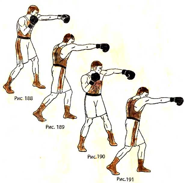 Выполняем прямой удар левой рукой в голову противника (рис. 188 - вид справа). Возвращая левую руку, отталкиваемся правой ногой и выполняем прямой удар правой рукой в голову противника, перенося вес тела полностью на левую ногу (рис. 189 — вид справа). Возвращая правую руку, отталкиваемся левой ногой и выполняем боковой удар левой рукой в голову противника, перенося часть веса тела на правую ногу (рис. 190 - вид справа). Возвращая левую руку, отталкиваемся правой ногой и выполняем прямой удар правой рукой в голову противника, перенося вес тела полностью на левую ногу (рис. 191 - вид справа).