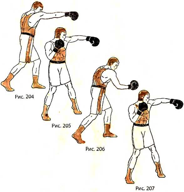 Отталкиваемся правой ногой и выполняем прямой удар правой рукой в голову противника, перенося вес тела полностью на левую ногу (рис. 204 - вид справа). Возвращая правую руку, слегка отталкиваемся левой ногой и выполняем боковой удар левой рукой в голову противника, перенося часть веса тела на правую ногу (рис. 205 — вид справа). Возвращая левую руку, отталкиваемся правой ногой и выполняем удар снизу правой рукой в туловище противника, перенося вес тела полностью на левую ногу (рис. 206 — вид справа). Возвращая правую руку, отталкиваемся левой ногой и выполняем боковой удар левой рукой в голову противника, перенося вес тела на правую ногу (рис. 207 - вид справа).