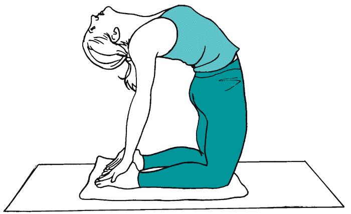 Чтобы выполнить позу верблюда (рисунок 20), постелите на коврик сложенное одеяло. Станьте на одеяло коленями и положите руки на талию. Поставьте колени и стопы на ширину бедер; носки должны смотреть строго назад. Подтяните копчик, вытяните корпус, отведите плечи назад и направьте нижние края лопаток внутрь спины. Переместите ладони на задние поверхности бедер.