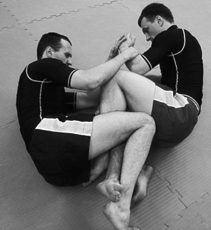 Пяткой дальней ноги, как крючком, плотно зацепите его стопу, протаскивая ее через вашу ближнюю ногу (рис. 463). Плотно зажав захваченную ногу противника между своими ногами, выполните поворот на другой бок и, продолжая поворот, выходите в положение, сидя на коленях (рис. 464, 465).