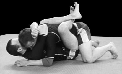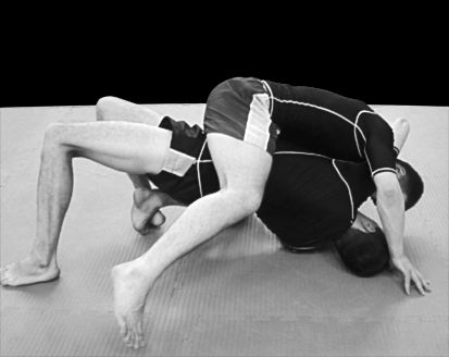 3. Выход 3. Противник находится в маунте в позиции сверху и готовится атаковать руками (рис. 472). Коленом одной из ног сильно подбейте его корпус вперед на себя и одновременно встаньте на мост так, чтобы ваш противник опрокинулся вперед (рис. 473). Если противник очень плотно сидит на вас, мостить можно несколькими сильными, повторяющимися один за другим толчками таза. Далее, крепко придерживая противника за шею одной рукой, другой плотно прихватите его руку в районе локтя и заблокируйте его одноименную ногу своей ногой (рис. 474). Затем резко и мощно сделайте мост и, переворачиваясь, выходите из маунта в позицию верхнего в гарде (рис. 475, 476).