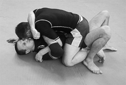 1. Выход 1. Противник находится в маунте в позиции сверху. Упритесь локтями ему в бедра так, чтобы прикрыть голову от возможной атаки и не дать ему перейти в позицию высокого маунта (рис. 461). Выполните креветку, поворачиваясь на бок и упираясь локтями в бедро противника (рис. 462).