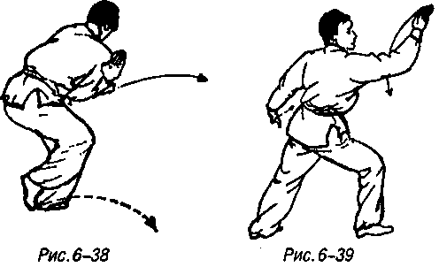 Продолжая предыдущее движение правая нога делает шаг вперед и останавливается у внутренней стороны левой ноги носком касаясь земли, тело полуприседает, одновременно корпус поворачивается влево, правая рука сверху идет вперед и влево-вниз, с внешним ребром ладони в качестве точки приложения силы наносит рубящий удар, левая ладонь размещается перед правым плечом (рис. 6-38).
