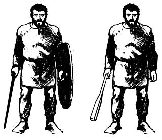 Вторая рука опущена вдоль тела. При использовании двух мечей вторая рука занимает симметричную позицию. При использовании щита рука чуть согнута в локте и отведена назад.