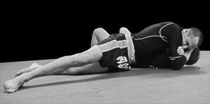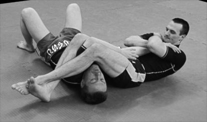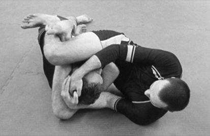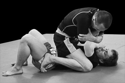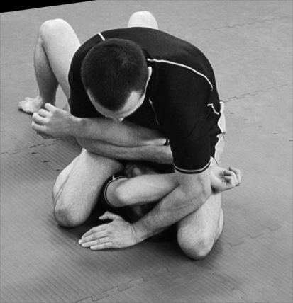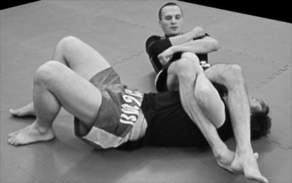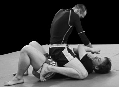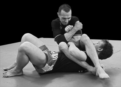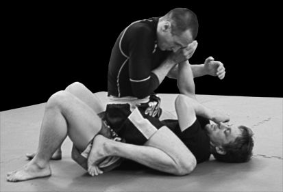 1. Рычаг локтя из маунта. Находясь в высоком маунте, прихватите своей правой рукой локоть правой руки противника, защищающегося от ударов подставкой рук (рис. 438, 439). Далее, плотно прижимая его локоть к своей груди, начинайте постепенно продвигать свое левое колено вверх, помогая себе левой рукой и пытаясь обвести голову противника по кругу (рис. 440). Двигаясь подобным образом, постоянно грузя противника своим весом и не оставляя ему свободного пространства, вы должны перейти в позицию S-маунт, подворачивая свою правую ногу и обводя левым коленом голову по кругу (рис. 441). Далее, перекинув свой вес на правый бок, скрестите обе ноги за левым плечом противника и только после этого опускайте свой таз вниз (рис. 442, 443). Плотно стискивая руки противника своими ногами, скрестите свои руки, удерживающие правую руку противника у себя на плечах и, объединенным усилием корпуса и ног, разорвите его замок руками, а затем, продолжая тянуть руками и поднимая таз вверх, проведите рычаг локтя (рис. 444). При проведении любых действий из маунта очень важна плотность, не оставляйте люфтов и не давайте противнику возможности уйти из-под маунта, используя дыры в вашей атаке.
