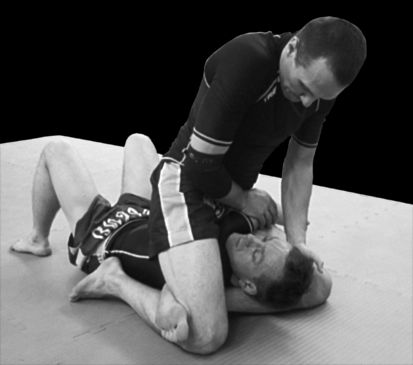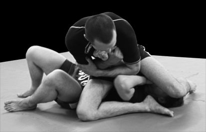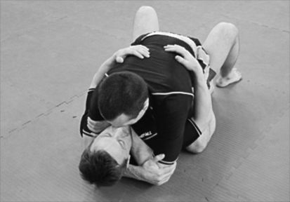 4. Удушение кулаком (иезекиль). Находясь в маунте, распластайтесь на противнике и, обхватив правой рукой его за шею, положите сжатый кулак левой руки ему на сонную артерию, а затем, обхватив свое левое предплечье правой ладонью, проводите сильное нажатие кулаком, пережимая сонную артерию и помогая себе головой (рис. 457, 458).