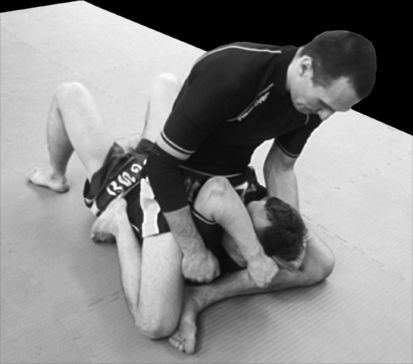 2. Треугольник ногами из маунта. Если во время выхода в высокий маунт вы обвели один локоть противника своим коленом, оставив другой локоть упертым в ваше бедро (рис. 452), у вас появляется хорошая возможность провести треугольник ногами. Не обводите сразу оба локтя, иначе противник просто выскользнет из вашего маунта!!! Приподнимите голову противника рукой, одноименной ноге, находящейся поверх локтя противника, чтобы лишить его возможности мостить, и перейдите в позицию S-маунта, подворачивая свою ногу ему под голову (рис. 453). Закройте треугольник ногами и заведите руку противника, оставшуюся в треугольнике, ему под шею и начинайте удушение (рис. 454). Если противник попытается сбросить вас во вращении, ничего страшного, продолжайте давление до победного конца. Можно даже помочь себе руками, с силой натягивая его голову на себя (рис. 455), и так до сдачи.