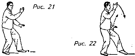 Движение 2: Передвиньте правую ступню на полстопы вперед, плавно откидывая корпус назад так, чтобы вес тела оказался перенесенным на правую ногу, затем переставьте левую ногу чуть-чуть вперед, касаясь ее пальцами пола и переходя к левому “свободному шагу”. Одновременно с этим поднимите правую руку прямо перед собой к правому виску, ладонью к лицу, а левую руку опустите к левому бедру, ладонью вниз. Взгляд теперь устремлен вперед (рис. 21, 22).