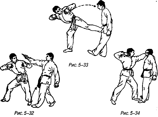 Движение не прекращается, вес тела полностью смещается на правую ногу, левая ног а быстро поднимается и с пяткой в качестве точки приложения силы распрямляясь в колене резко наносит обратный толчковый удар в пах или живот (рис. 5-33).