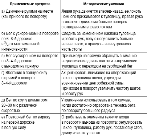 Важную роль в беге по повороту играет правильная постановка стоп и работа рук. Так, ступни ног при этом ставятся с небольшим поворотом влево, и при постановке левой стопы на грунт преобладает давление на наружную часть подошвы, а при постановке правой – на внутреннюю. Движения рук также несколько отличаются от движений рук при беге по прямой: правая рука направлена больше внутрь, а левая – несколько наружу.