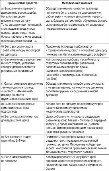 Старт. В спринте применяется низкий старт, позволяющий быстрее начать бег и достичь максимальной скорости на коротком отрезке. Для ускорения в начале бега используются стартовые колодки, обеспечивающие твердую опору для отталкивания и постоянные углы наклона опорных площадок. Их расположение определяется в процессе тренировки и зависит от индивидуальных особенностей спортсмена, его роста, длины конечностей, уровня развития скоростно-силовых качеств.
