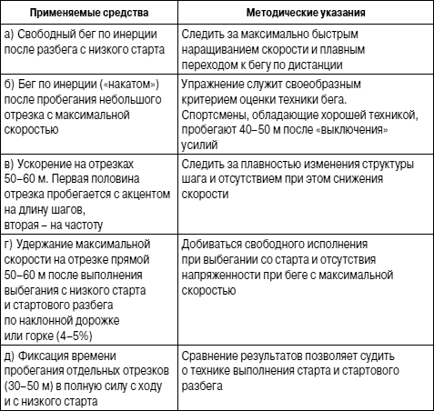 Одновременно с нарастанием скорости и уменьшением величины ускорения наклон тела уменьшается, а техника бега постепенно приближается к технике бега на дистанции. При этом скорость в стартовом разбеге увеличивается за счет возрастания длины шагов, сокращения времени опоры при практически неизменном времени шагов. Выпрямление туловища и переход к бегу по дистанции у спортсменов высокой квалификации происходит на 25–30-м метре (13–15 беговых шагов), когда достигается 90–95 % максимальной скорости бега.