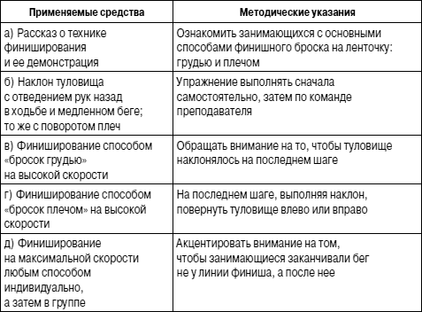 Часто начинающие спортсмены в естественном желании быть первыми начинают финальный бросок за 3–4 шага и эти последние метры пробегают в неудобном, «падающем» положении, что снижает скорость, а иногда ведет к падению бегуна. Поэтому спринтерам, не овладевшим техникой финиширования, рекомендуется пробегать финишный створ на полной скорости, не обращая внимания на соперников, не думая о броске или прыжке на ленточку. При этом через финишную линию следует пробегать так, словно до нее еще осталось полметра.