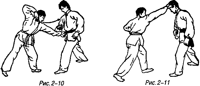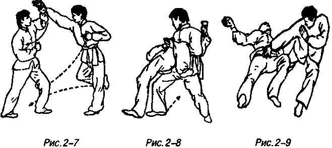 Если противник блокирует, то правая нога, следуя движению опускается слева от противника, корпус нагибается, правая рука идет вниз слева направо с центром ладони обращенным вверх и наносит вытягивающий удар по груди противника, левая рука снаружи идет внутрь и вверх, подхватывая ногу противника, корпус поворачивается влево вынуждая противника упасть на спину (рис. 2-8).