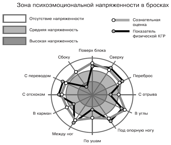 На рис. 123 демонстрируется соотношение данных сознательной оценки гандболисткой своих возможностей при выполнении различных способов броска и данных регистрации на индикаторе аппарата.