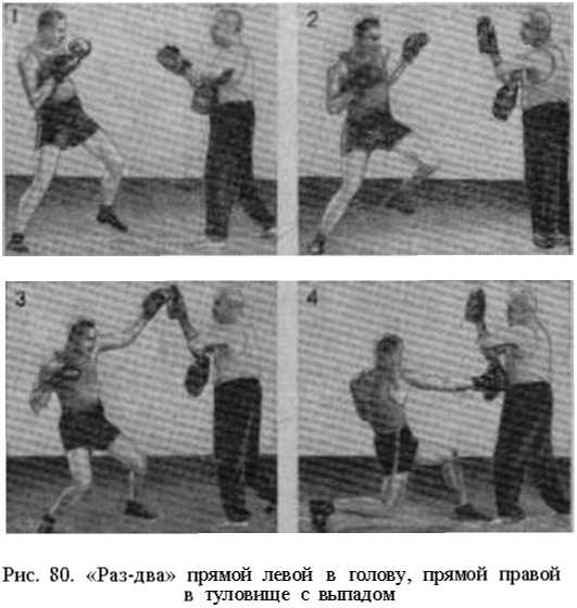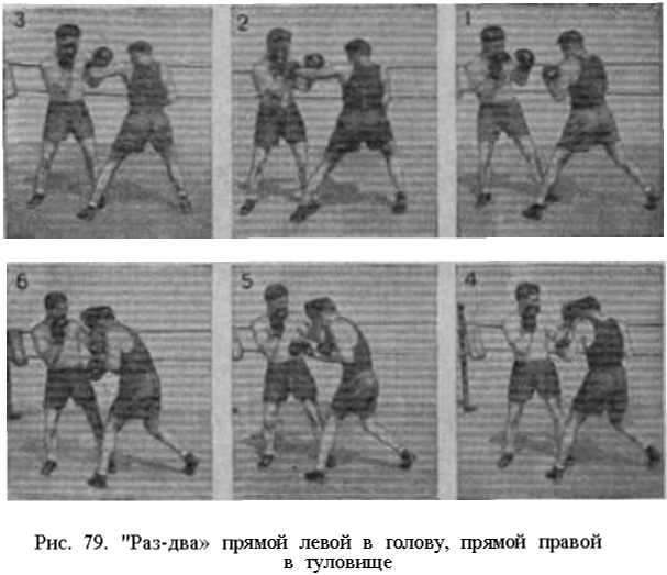 Эту комбинацию многие боксеры выполняют, делая удар левой рукой под шаг левой ногой, а второй удар — правой в туловище — одновременно с приставкой правой ноги. По наилучшей формой этой комбинации следует признать такую, когда удар правой после финта левой в голову наносят под шаг левой ногой (рис. 79).