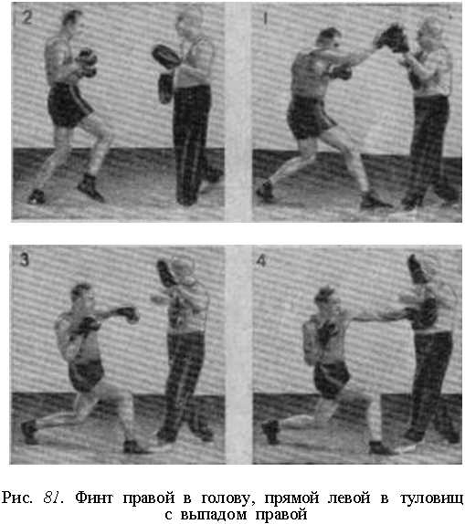 Разновидность комбинации: финт правой в голову, удар левой в туловище на выпаде правой ногой (рис 81).