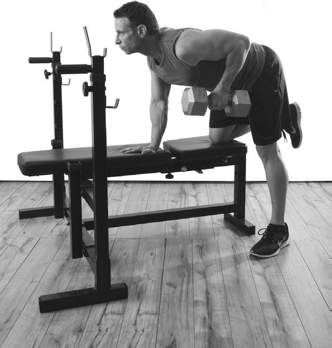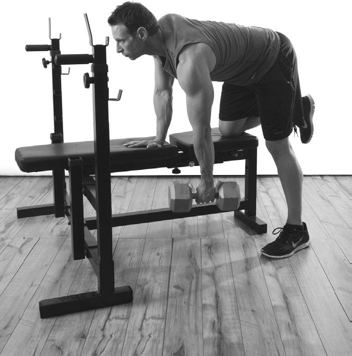 1. Поставьте на горизонтальную скамью правое колено, наклонитесь вперед и для устойчивости обопритесь о нее правой рукой. Левую ногу переместите немного назад. Держите гантель в свободно опущенной левой руке на одной вертикали с плечом.