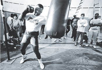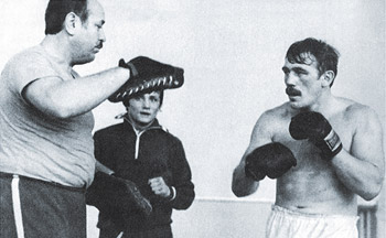 На лапах отрабатывались варианты защиты блоками, нырками, уклонами и приседами, после чего боксёр оттачивал контратаки короткими ударами от подбородка. Плечевой пояс при этом расслаблен, удары наносились жёстко и точно.