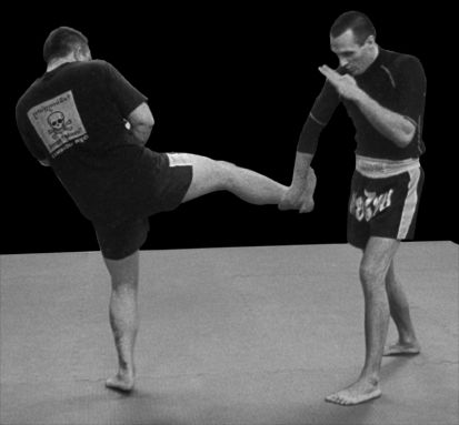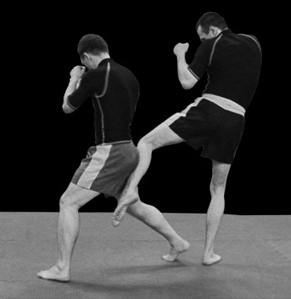 1. Противник наносит прямой удар ногой в живот — делаем мощный круговой сбив снаружи внутрь, так, чтобы вашего противника развернуло к вам боком или спиной, и сразу же наносим мощный лоу-кик ему в бедро (рис. 297, 298). Лоу-кик можно заменить стаптывающим ударом ребром стопы в колено (рис. 299—301).