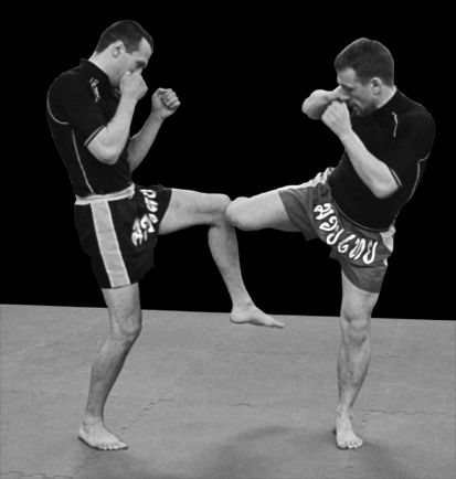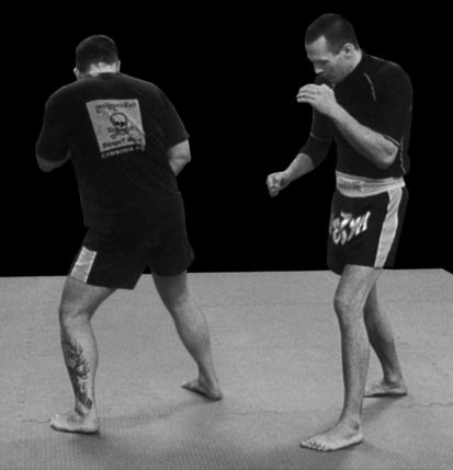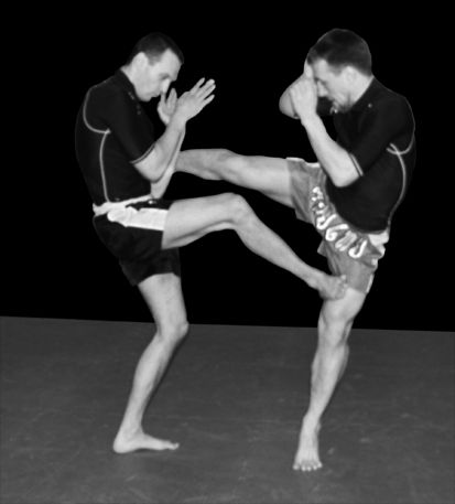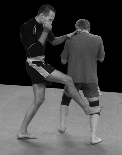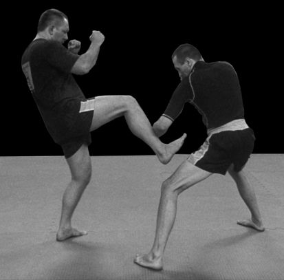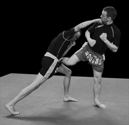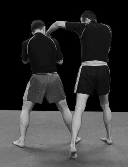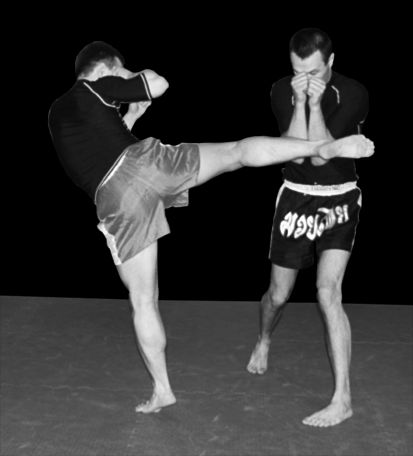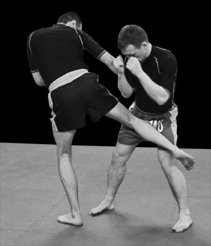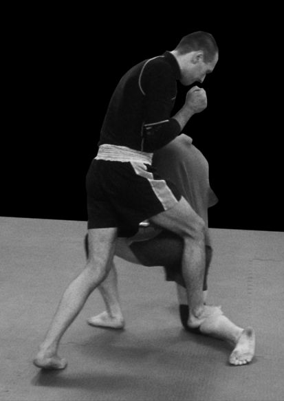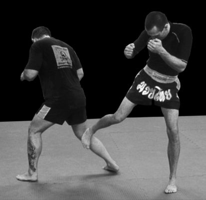 4. Противник наносит круговой удар ногой в живот — одновременно с подставкой локтями выполняем мощный пинок пяткой ему в колено (рис. 306). Внимание – это весьма травмоопасная техника, отрабатывайте ее в легкий контакт!