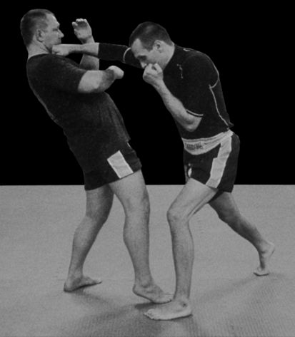 3. Противник наносит круговой удар ногой в живот — выполняем подставку локтями и сразу же на сближении атакуем прямым или боковым ударом руки в голову (рис. 304, 305).
