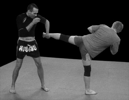 7. Противник атакует лоу-киком — быстро подсаживаемся и, прикрыв голову, наносим ему встречный прямой удар правой рукой в голову (рис. 312).