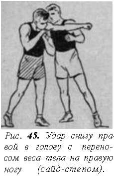 Искусные боксеры применяют еще один вариант удара снизу, соединяя основной удар снизу с уходом в сторону и поворотом (рис. 45). Этот вариант применяют как