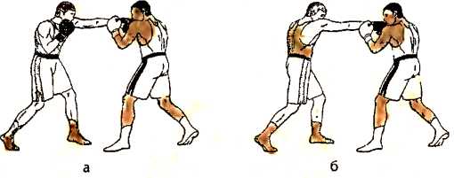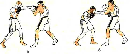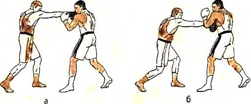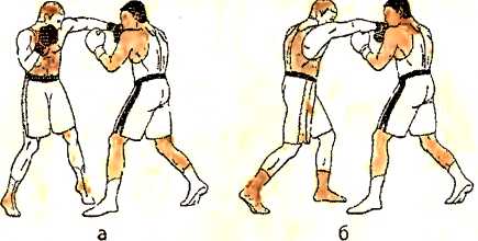 б ) отталкиваемся правой ногой и наносим ответный прямой удар правой рукой в туловище противника;