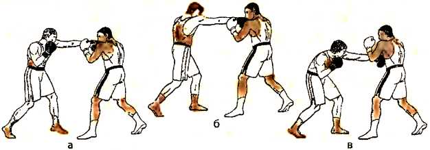 в ) отталкиваемся правой ногой и, одновременно с шагом левой ногой вперед, наносим ответный прямой удар левой рукой в туловище противника;