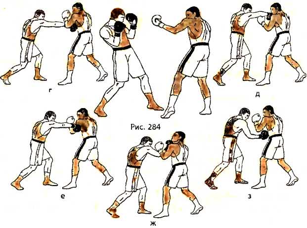 ж ) отталкиваемся правой ногой и наносим ответный удар снизу правой рукой в туловище противника.