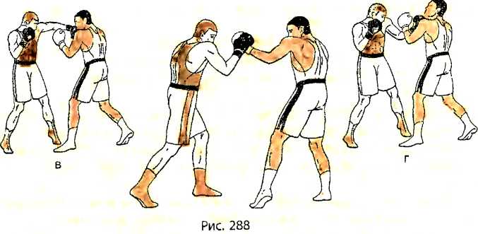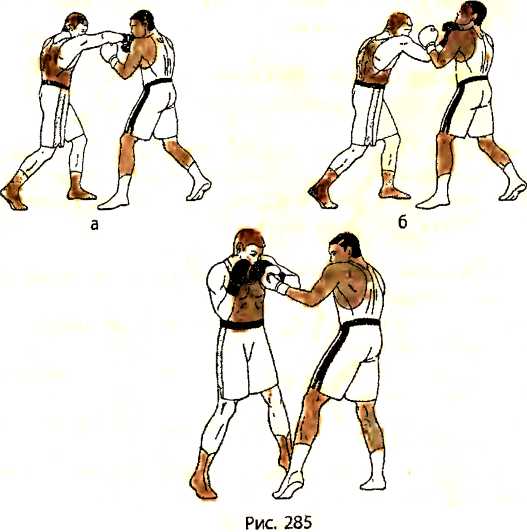 В ответ на удар снизу левой рукой в голову со стороны противника, отталкиваемся левой ногой и, отклоняясь туловищем назад, делаем шаг правой ногой назад, перенося большую часть веса тела на правую ногу (рис. 284 - вид справа). Как только правая нога получает опору, тут же подтягиваем к ней левую ногу.