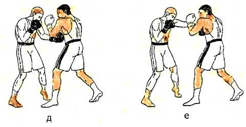 е ) отталкиваемся правой ногой и наносим ответный прямой удар правой рукой в туловище противника.