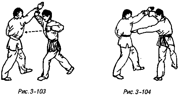 Из позиции для атаки швыряемой ладонью, когда противник правой ладонью наносит через верх круговой рубящий удар вниз по голове или шее, я следуя ситуации толкаю правой ногой землю, левую ногу продвигаю влево-вперед, правая нога естественно подшагивает на полшага, одновременно правое предплечье поворачивается вокруг своей оси внутрь и с краем локтевой кости в качестве точки приложения силы, подпираю спереди-сверху от лба с ладонью обращенной центром вперед, блокируя руку противника (рис. 3-103).
