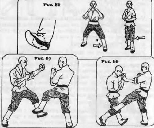 Эта подсечка ноги противника. Если противник стоит, выставив далеко вперед ногу, или располагает ноги близко одна к другой, это хорошая возможность вывести его из равновесия или даже свалить на землю. Подсечка выполняется сметающим движением передней или задней ногой; наносится выемкой стопы в голеностопный или коленный сустав (рис. 86).