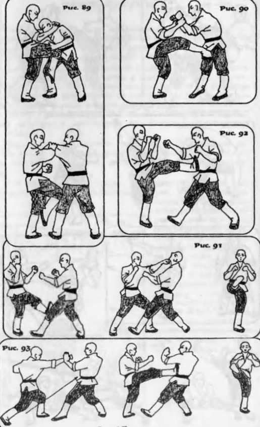Удар выполняется подымающим движением, нога остается немного согнутой в колене, носок ступни опущен в продолжение голени. Удар наносится голенью и верхней частью ступни — подальше от пальцев — в пах (рис. 90).