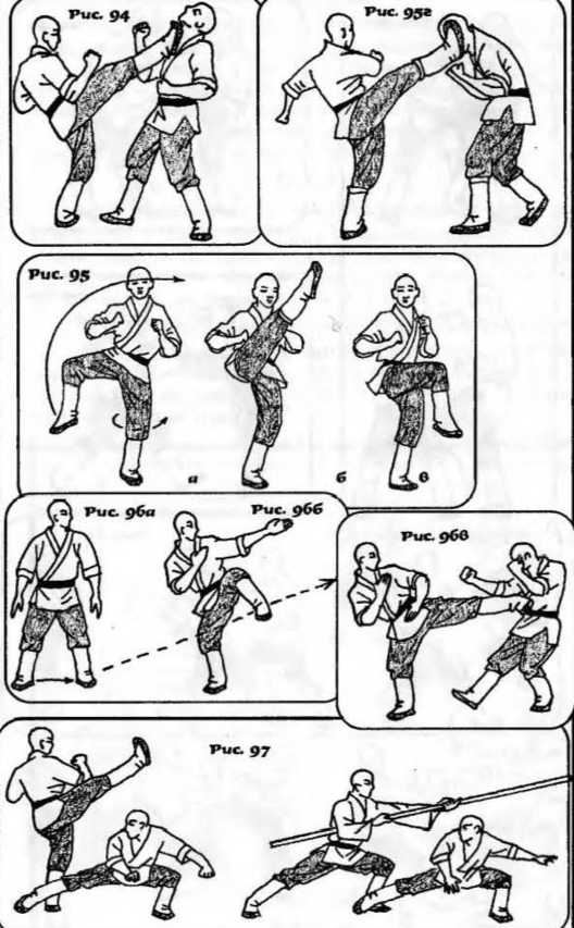В шаолиньском способе боя используются немногочисленные, но простые и надежные приемы ногами.
