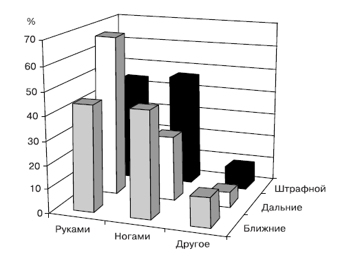 Рис. 112. Количество мячей, отраженных руками и ногами с разного расстояния