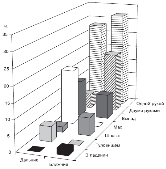 Для задержания мяча, летящего в ворота после броска нападающего, вратарь применяет в основном восемь приемов. Из них более 60 % вратарям приходится задерживать мяч с ближнего расстояния, около 28 % – с дальнего и в 12 % случаев – со штрафного броска. Общее количество способов задержания мяча руками более чем в 2 раза превышает выполнение приема ногами (соответственно 69 и 31 %). Всего 7 % из общего количества приходится на способы задержания туловищем и в падении (рис. 112).