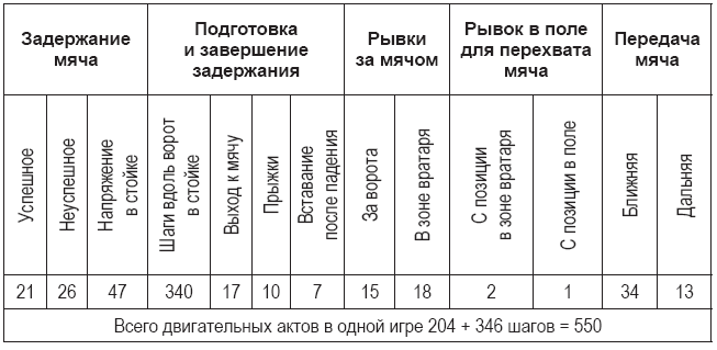 Кроме выполнения приема задержания мяча непосредственно в воротах, вратарь совершает еще некоторую физическую работу (табл.21).