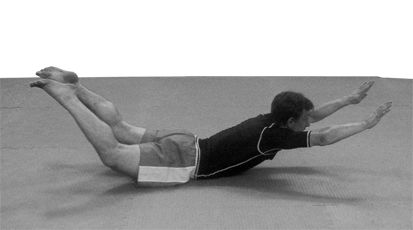 3. Обратная книжка – лягте животом на пол и, раскинув руки и ноги в стороны, выполняйте прогибы спины, одновременно поднимая ноги и корпус как можно выше. Постепенно доведите количество повторений до 100—120 (рис. 5, 6).