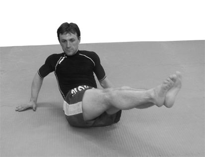 6. Упражнение на пресс – сядьте на пол, упритесь локтями в пол и поднимите корпус и ноги. Выполняйте упражнение «ножницы» – ритмично сводя и разводя прямые ноги. Выполнив 150 сведений-разведений, не прерываясь, сделайте 30 вращений прямыми ногами по часовой и 30 вращений против часовой стрелки. После этого положите руки за голову и останьтесь сидеть на полу с поднятыми выпрямленными ногами и поднятым корпусом и сразу начинайте ритмично скручивать корпус вокруг оси в одну и в другую сторону, выполнив таким образом не менее 60 скручиваний. Все вышеописанное упражнение выполняется нон-стоп, не опуская ног на землю (рис. 9—14).