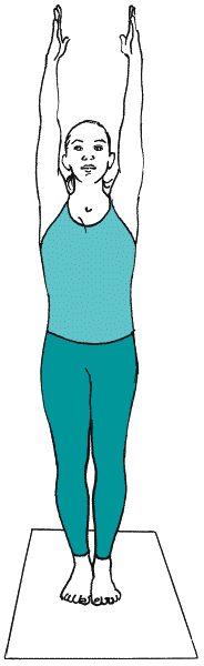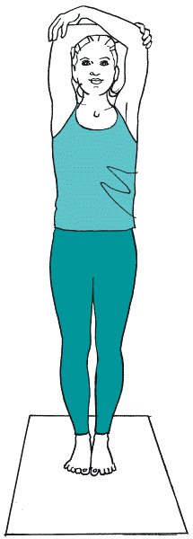 Встаньте в тадасану и поднимите руки над головой. Затем согните их и обхватите ладонями локти (рисунок 1В). Начните тянуться локтями вверх, вытягивая боковую поверхность корпуса. Лопатки направляйте внутрь спины, а дельтовидные мышцы (толстые поверхностные мышцы, образующие наружный контур плеч) – вниз. Расширяйте грудную клетку (но не поднимайте нижние ребра) и следите за тем, чтобы локти, плечи, бедра и носки находились на одной вертикальной линии. Не прогибайтесь в пояснице и не подавайте живот вперед. Смените обхват локтей, для чего сначала вытяните руки над головой, а потом снова согните их в локтях. Чтобы выйти из асаны, сделайте выдох, опустите руки вдоль туловища и расслабьтесь.