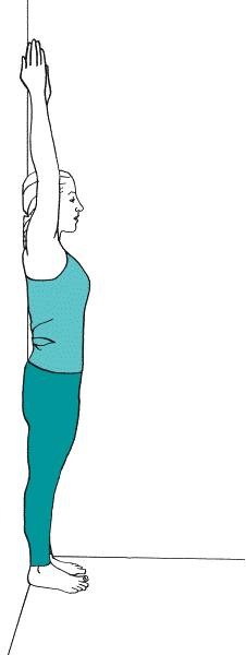 Продолжайте направлять руки вверх и назад, пока они не коснутся стены. Следите за тем, чтобы плечи оставались развернутыми и не поднимались к ушам.
