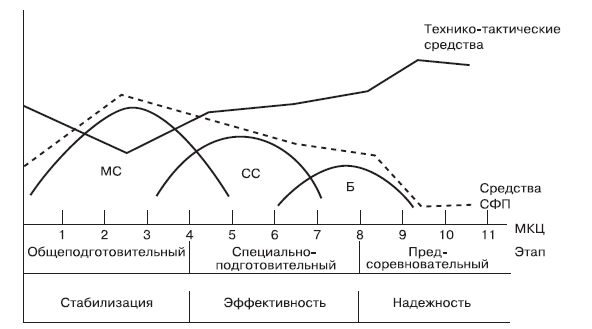 На общеподготовительном этапе нужна морфосиловая (МС) подготовка (рис. 119). Далее на ее основе наращивается взрывная сила средствами скоростно-силовой (СС) направленности, а в предсоревновательном этапе совершенствуется только быстрота (Б) и точность.