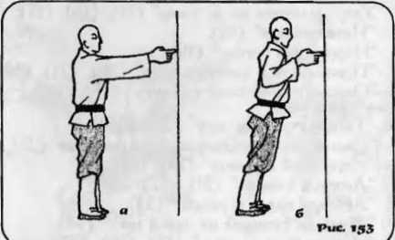 3) Стоять, упираясь пальцем в стену. Необходимо встать лицом к стене на расстоянии выпрямленных рук. Коснитесь стены указательными пальцами обеих рук, пальцы на ширине плеч (рис. 153а). Согните руки в локтях, наклоняя прямое тело к стене (рис. 153б), затем выпрямите их, вернувшись в исходное положение. Это упражнение укрепляет весь палец, Выполняйте его столько раз, сколько позволяет сила пальцы. Будьте осторожны.