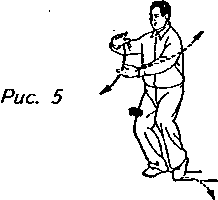 Движение 1 (продолжает рис. 4): Немного поверните корпус вправо и отставьте носок правой ноги чуть-чуть в сторону. С поворотом тела ваша левая рука должна перейти направо по кривой и оказаться под правыми ребрами с ладонью, направленной кверху; а правая рука должна перейти по кривой вверх и назад и оказаться перед грудью. Обе руки теперь расположены так, будто держат большой мяч. Одновременно с этим передвиньте левую стопу поближе к правой, упираясь кончиками пальцев левой ноги в землю. Взгляд направлен в сторону правой руки (рис. 5).