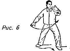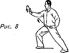 Движение 4: Правой ногой шагните вправо и перенесите на нее тяжесть своего тела, переходя на правый “шаг вдоль кромки радуги”. Одновременно с этим правую руку переведите вправо и вверх до уровня плеча, ладонью внутрь, как бы отбивая атаку. Левую руку опустите к левому бедру ладонью вниз. Взгляд должен быть обращен к правому запястью. Это упражнение называется “отражение удара” (рис. 8).
